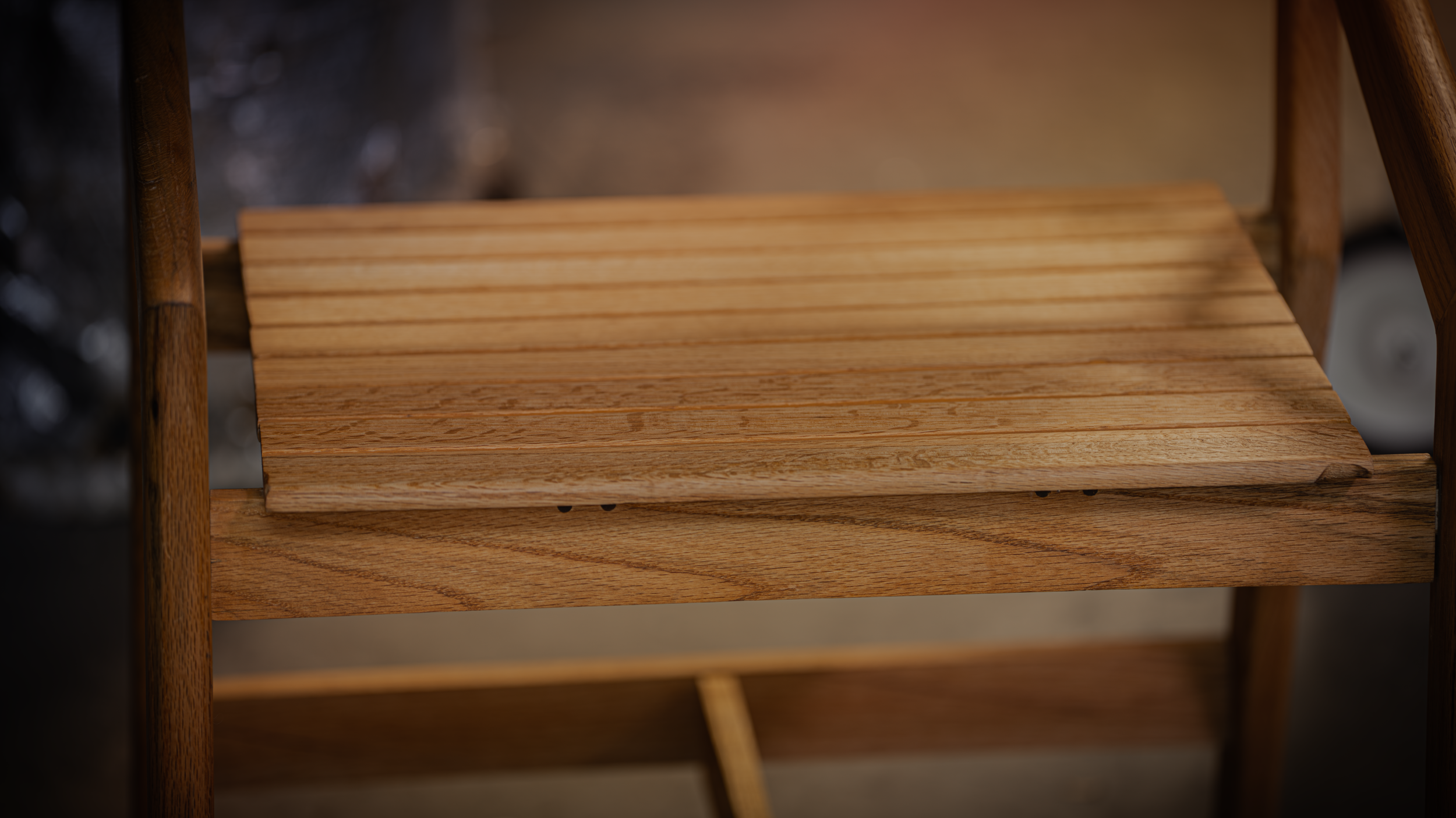 The bottom brace of the chair functions as a structural element resisting shear forces, providing necessary stability to the frame. Based on observations from previous prototypes, this component proved essential in maintaining the chair’s alignment and stable under load. Like the seat, its joinery employs D8 domino connectors and half-through dowel joints.